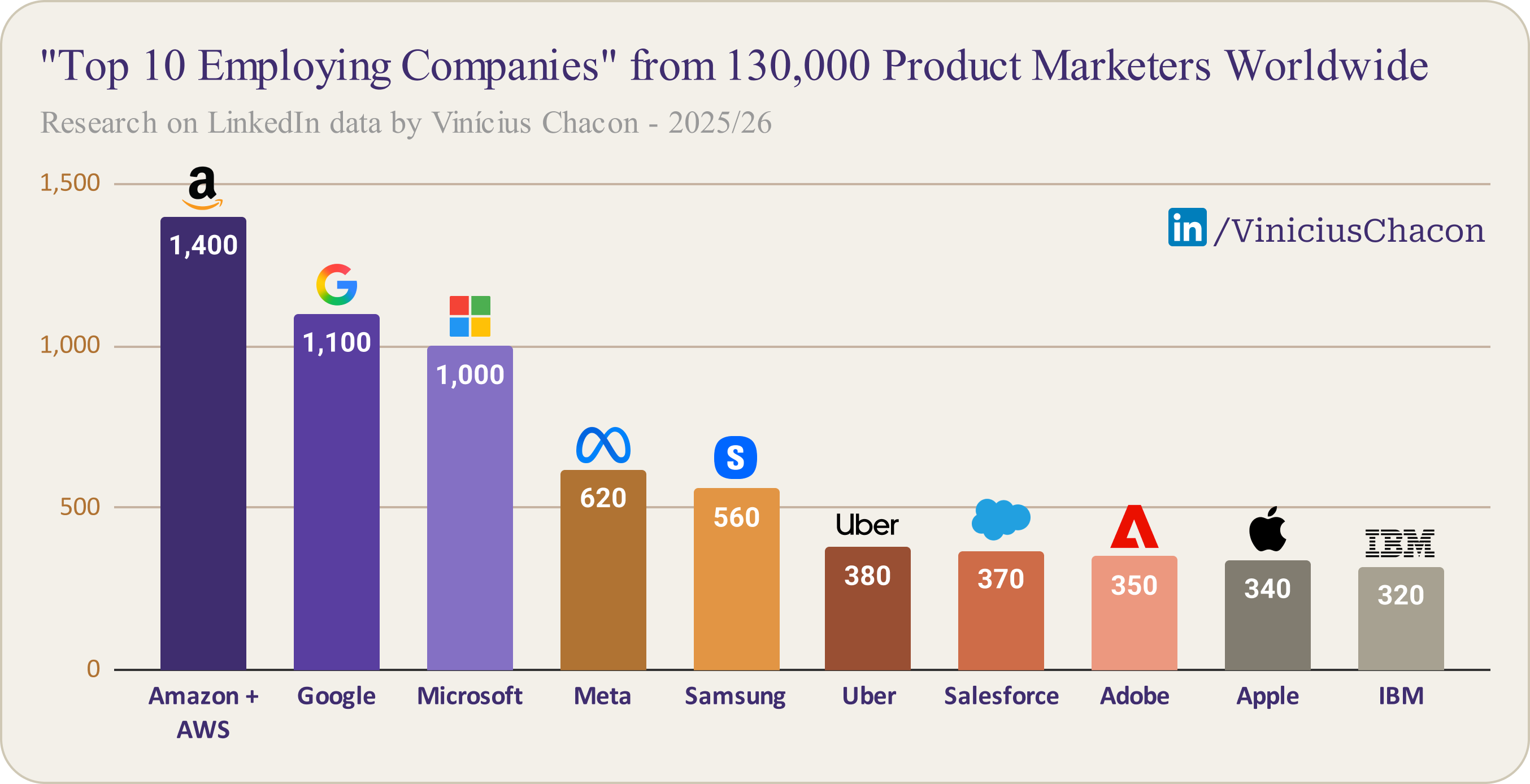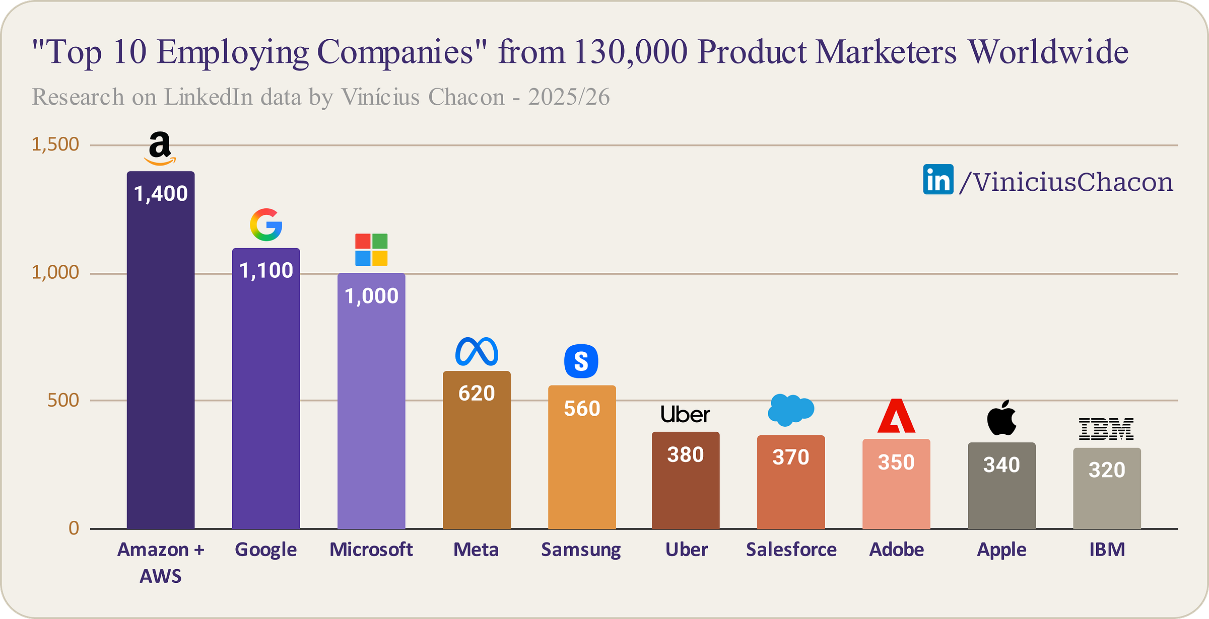 Remarkably, roughly 5% of all Product Marketers worldwide are concentrated in just 10 companies: Amazon (+AWS), Google, Microsoft, Meta, Samsung, Uber, Salesforce, Adobe, Apple, and IBM.