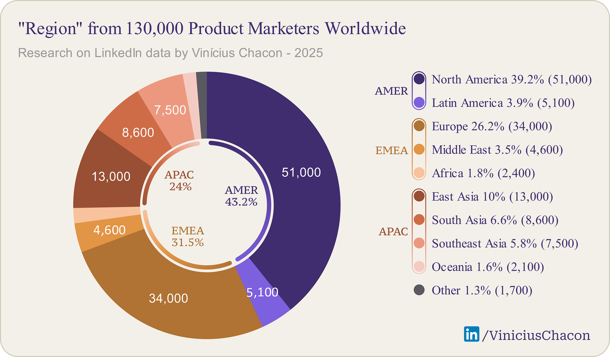 North America remains the heavyweight champion, hosting 39.2% of the world’s Product Marketers. Europe follows as the second-largest established hub with 26.2%.