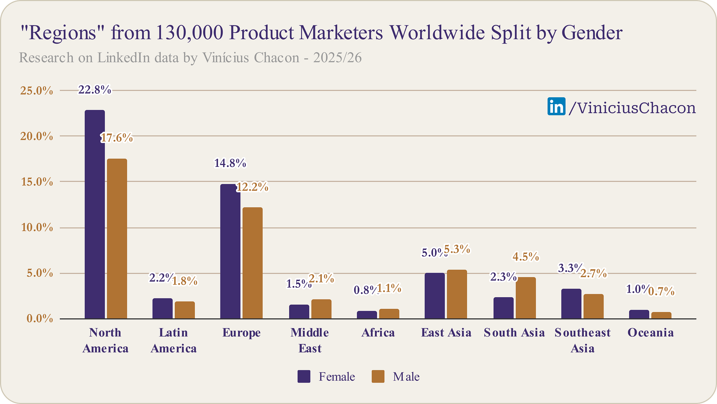 When we look at gender distribution, Product Marketing stands out as a refreshing outlier in the tech world. In major hubs like North America, Europe, and Latin America, the data shows a higher proportion of women driving the discipline. However, this isn’t a universal rule: in regions like South Asia and Africa, the role remains predominantly male.
