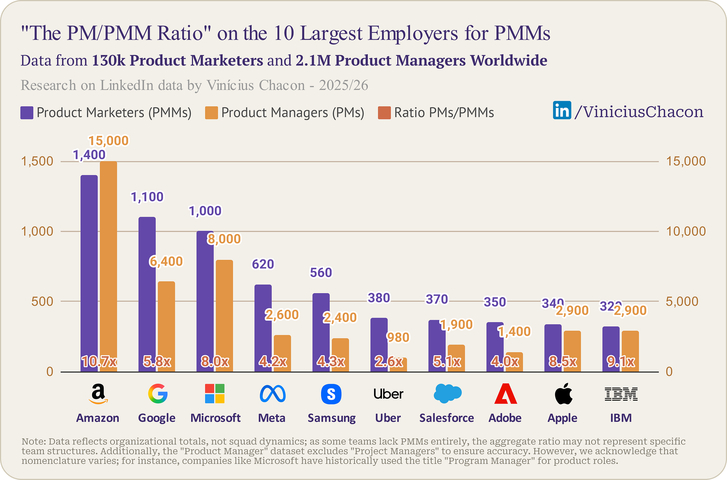 The “Strategic Hub” Model (High Ratio): Companies like Amazon (10.7x), IBM (9.1x), and Microsoft (8.0x) operate with a massive surplus of PMs.