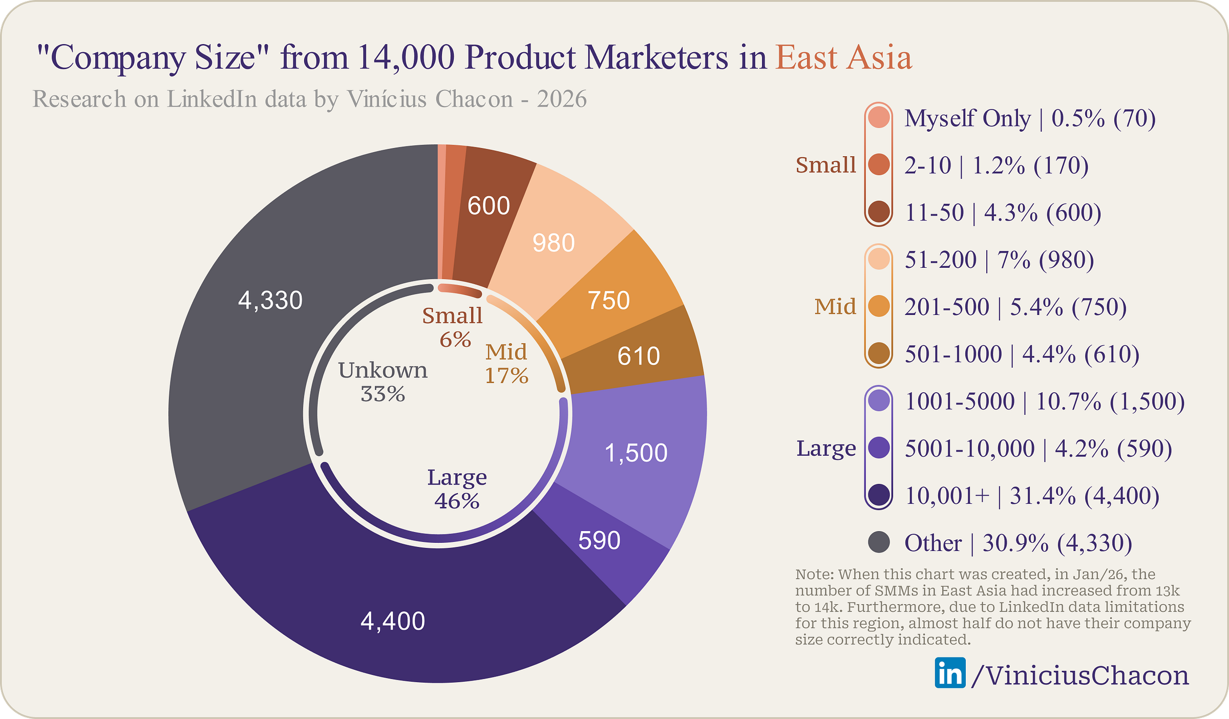This region is dominated by established economic powerhouses. While mainland China shows ~2,700 visible PMMs (likely suppressed by platform restrictions), Taiwan (1,800), Japan (1,700), and Hong Kong (1,100) drive the narrative. Normalizing the data reveals that 67% of PMMs here work in Large Enterprises (>1,000 employees), while only 9% work in small businesses—the lowest startup representation in the world.